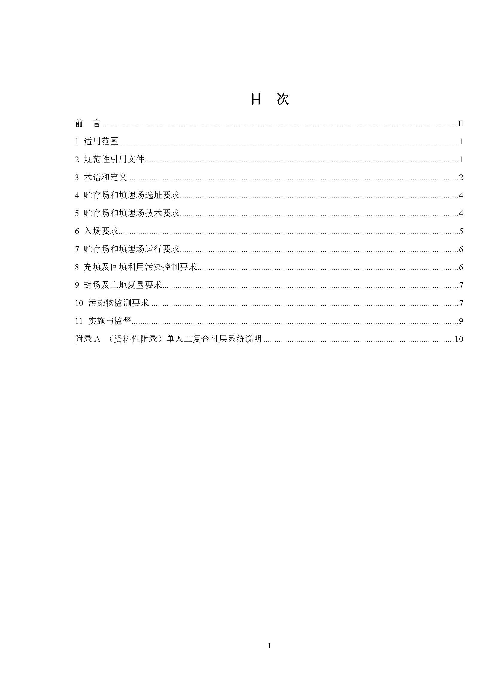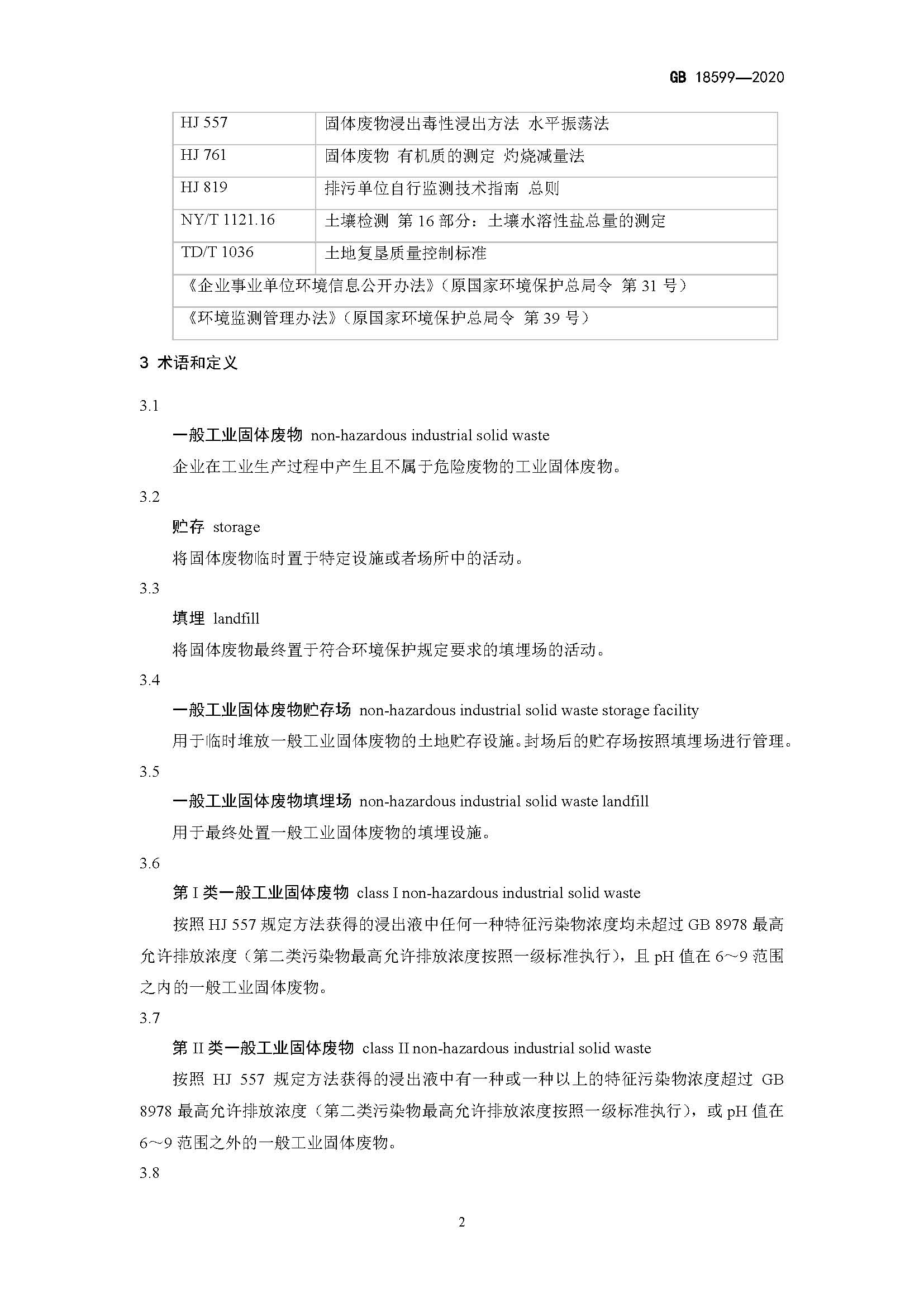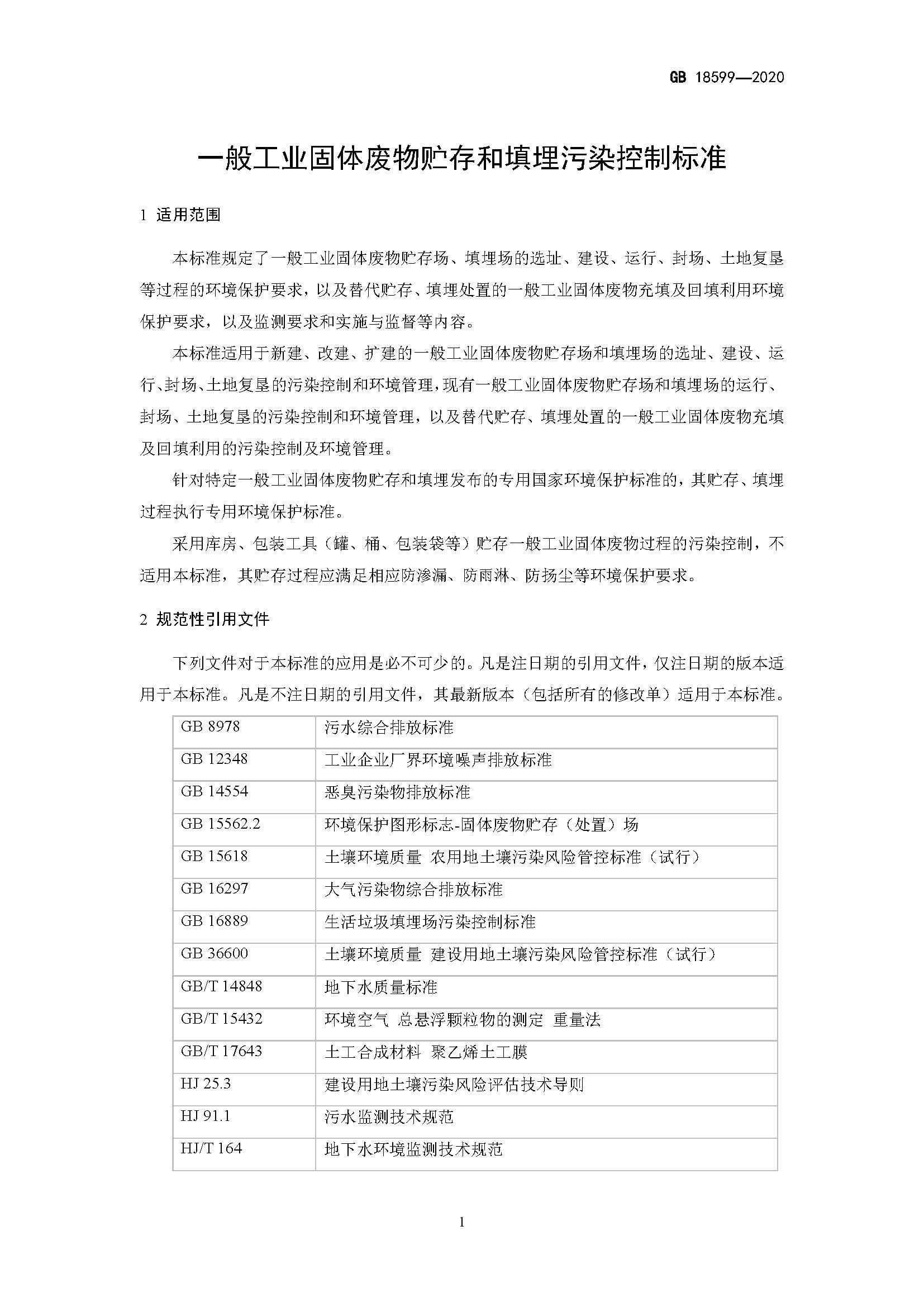 為貫徹《中華人民共和國環(huán)境保護法》《中華人民共和國固體廢物污染環(huán)境防治法》《中 華人民共和國水污染防治法》《中華人民共和國大氣污染防治法》《中華人民共和國土壤污染 防治法》等法律法規(guī),防治環(huán)境污染,改善生態(tài)環(huán)境質(zhì)量,推動一般工業(yè)固體廢物貯存、填 埋技術(shù)進步,制定本標準。 本標準規(guī)定了一般工業(yè)固體廢物貯存場、填埋場的選址、建設(shè)、運行、封場、土地復墾 等過程的環(huán)境保護要求,以及替代貯存、填埋處置的一般工業(yè)固體廢物充填及回填利用環(huán)境 保護要求,以及監(jiān)測要求和實施與監(jiān)督等內(nèi)容。 本標準為強制性標準。 本標準首次發(fā)布于 2001 年,本次為首次修訂。