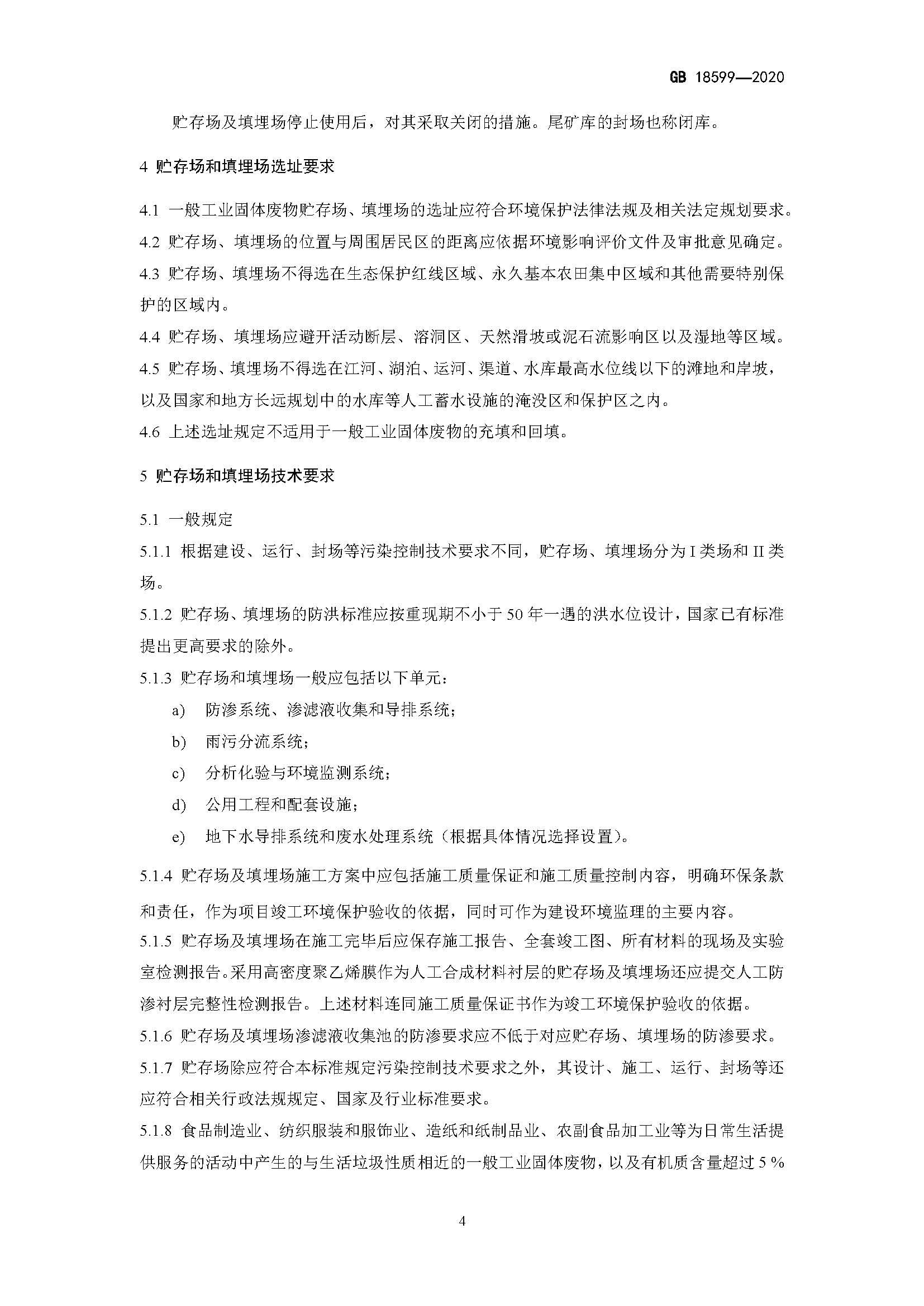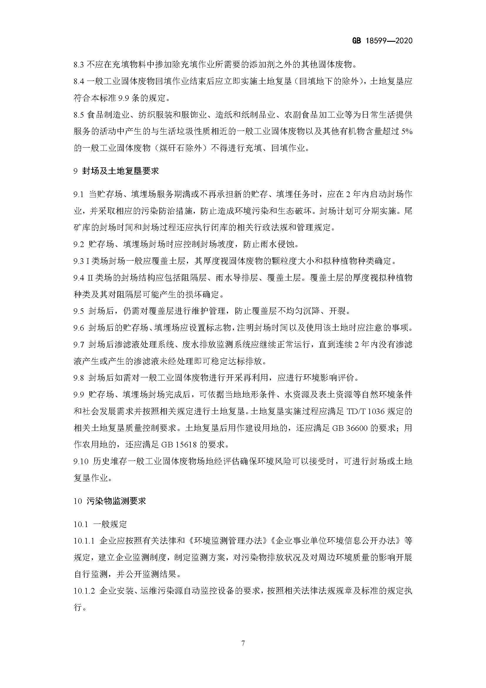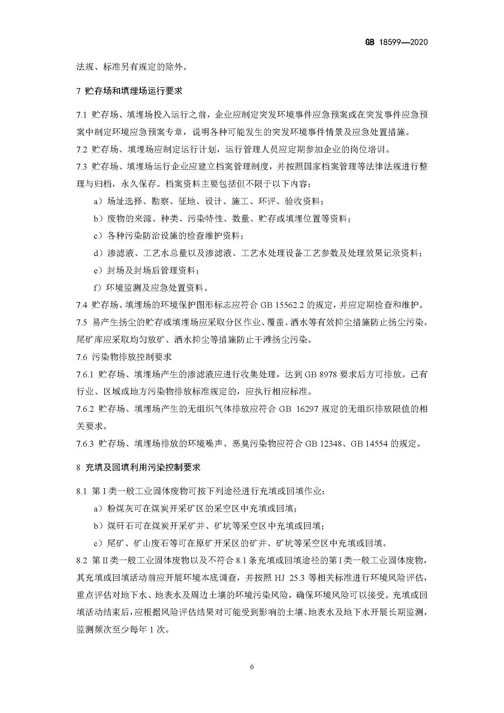 為貫徹《中華人民共和國環(huán)境保護法》《中華人民共和國固體廢物污染環(huán)境防治法》《中 華人民共和國水污染防治法》《中華人民共和國大氣污染防治法》《中華人民共和國土壤污染 防治法》等法律法規(guī),防治環(huán)境污染,改善生態(tài)環(huán)境質(zhì)量,推動一般工業(yè)固體廢物貯存、填 埋技術(shù)進步,制定本標準。 本標準規(guī)定了一般工業(yè)固體廢物貯存場、填埋場的選址、建設(shè)、運行、封場、土地復墾 等過程的環(huán)境保護要求,以及替代貯存、填埋處置的一般工業(yè)固體廢物充填及回填利用環(huán)境 保護要求,以及監(jiān)測要求和實施與監(jiān)督等內(nèi)容。 本標準為強制性標準。 本標準首次發(fā)布于 2001 年,本次為首次修訂。