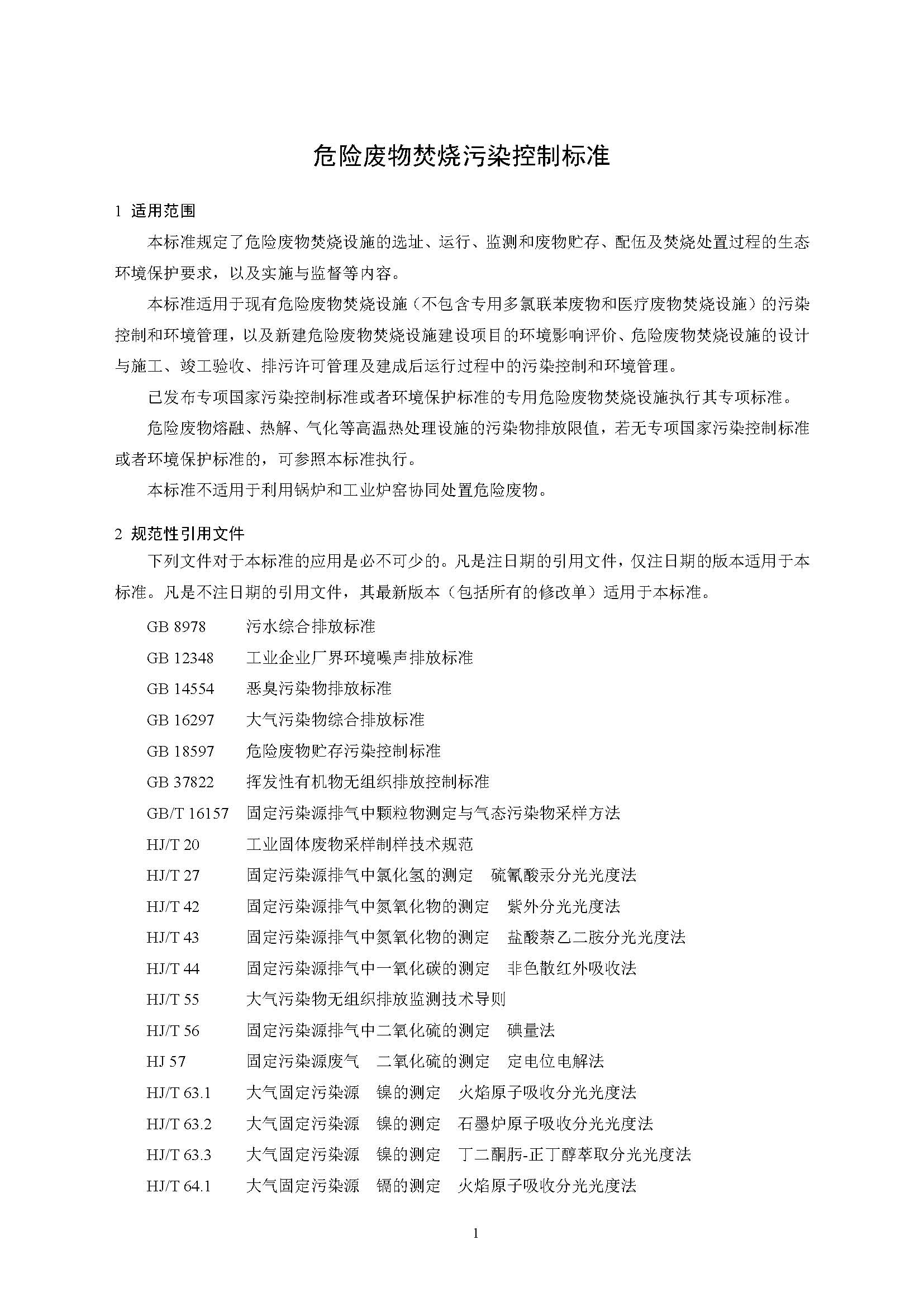 為貫徹《中華人民共和國(guó)環(huán)境保護(hù)法》《中華人民共和國(guó)固體廢物污染環(huán)境防治法》《中華人 民共和國(guó)水污染防治法》《中華人民共和國(guó)土壤污染防治法》《中華人民共和國(guó)大氣污染防治法》 等法律法規(guī),防治環(huán)境污染,改善生態(tài)環(huán)境質(zhì)量,制定本標(biāo)準(zhǔn)。 本標(biāo)準(zhǔn)規(guī)定了危險(xiǎn)廢物焚燒設(shè)施的選址、運(yùn)行、監(jiān)測(cè)和廢物貯存、配伍及焚燒處置過程的生態(tài) 環(huán)境保護(hù)要求,以及實(shí)施與監(jiān)督等內(nèi)容。 本標(biāo)準(zhǔn)為強(qiáng)制性標(biāo)準(zhǔn)。 本標(biāo)準(zhǔn)首次發(fā)布于 1999 年,2001 年第一次修訂,本次為第二次修訂。
