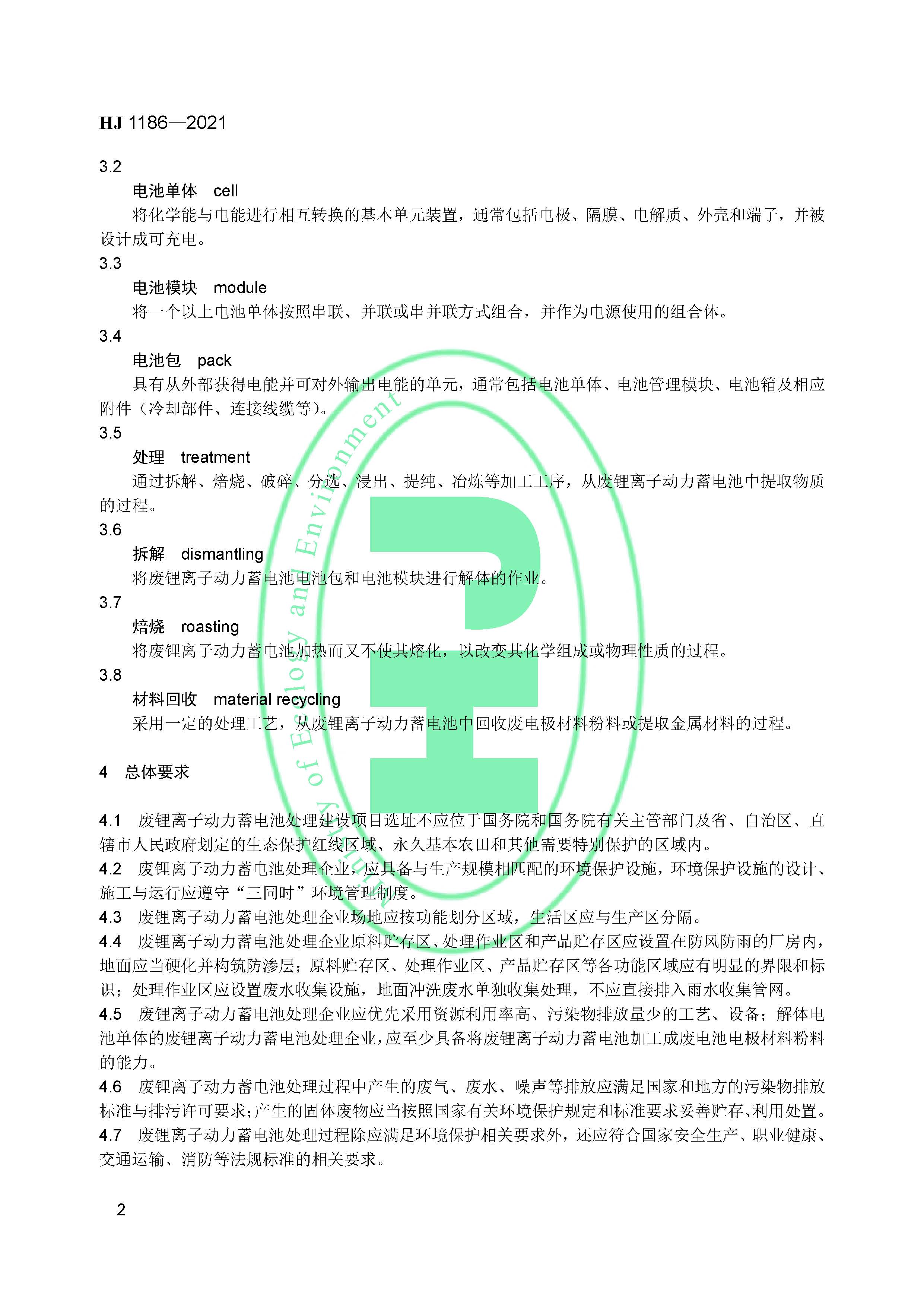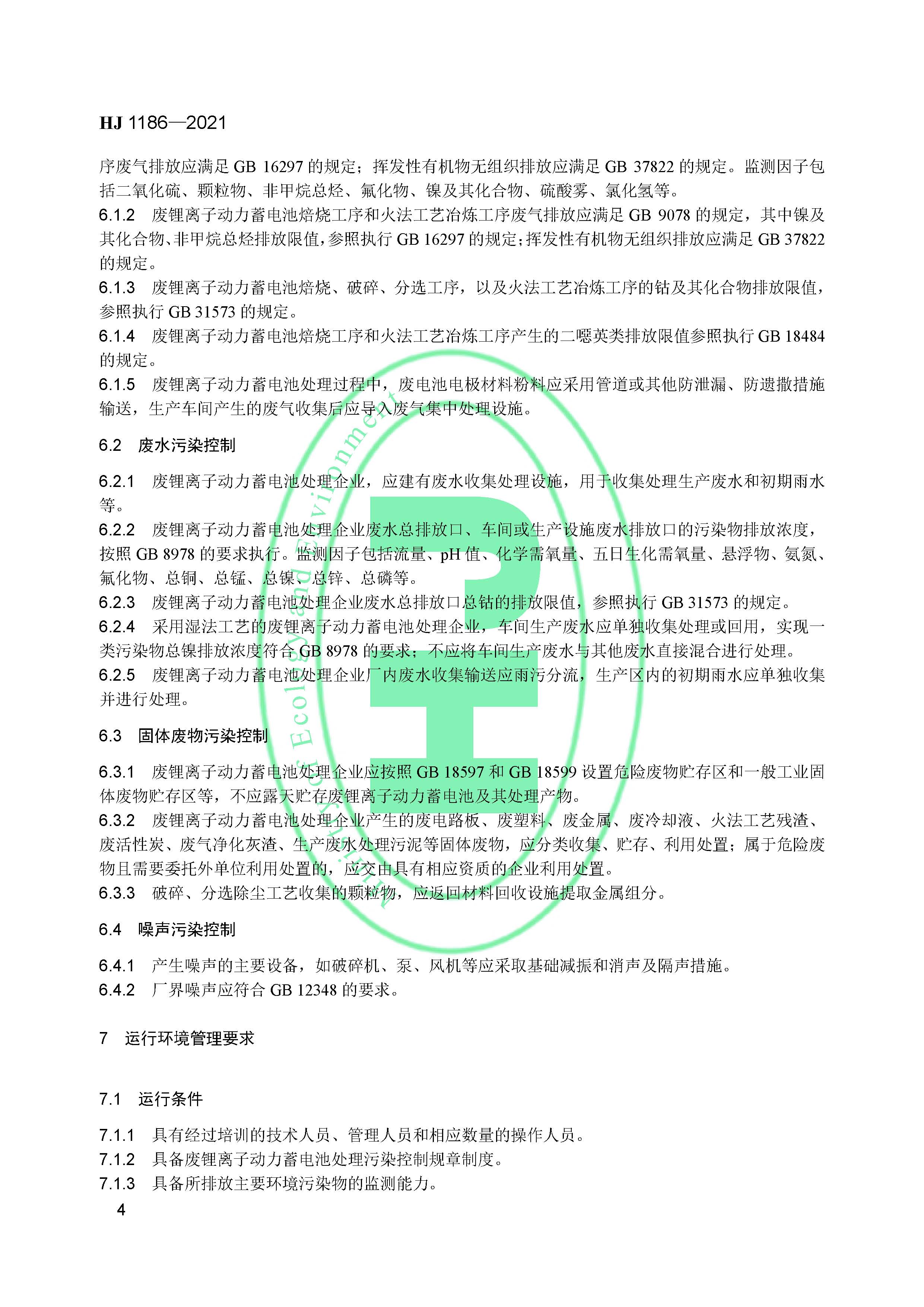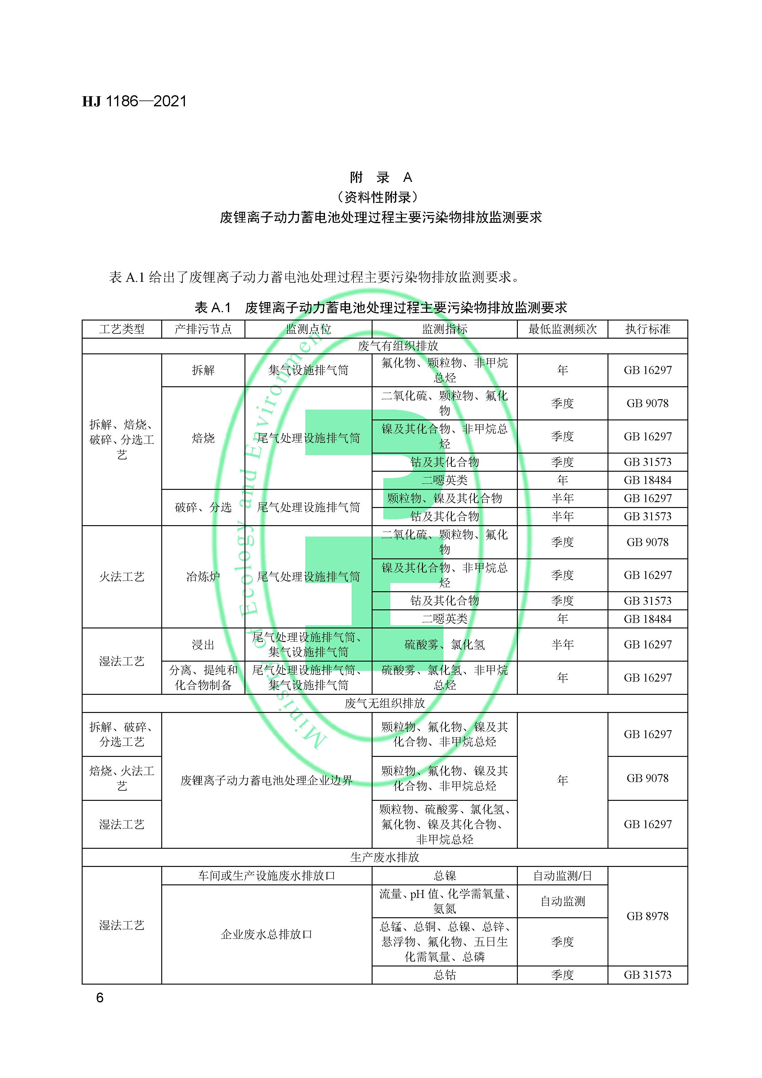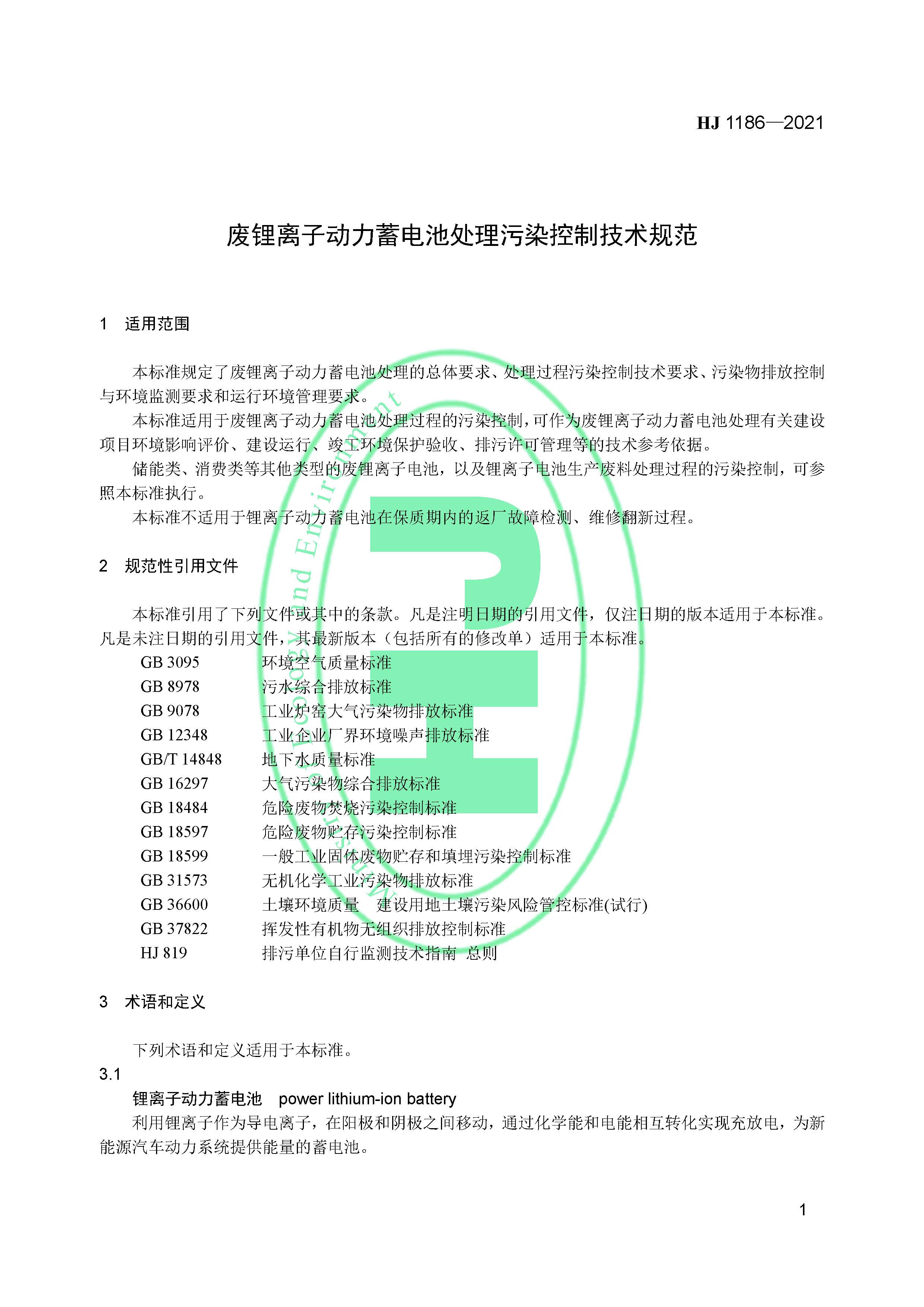 為貫徹《中華人民共和國環(huán)境保護(hù)法》《中華人民共和國固體廢物污染環(huán)境防治法》等法律法規(guī),防治污染,保護(hù)生態(tài)環(huán)境,規(guī)范和指導(dǎo)廢鋰離子動力蓄電池處理過程,制定本標(biāo)準(zhǔn)。本標(biāo)準(zhǔn)規(guī)定了廢鋰離子動力蓄電池處理過程的污染控制技術(shù)要求和運(yùn)行環(huán)境管理要求。本標(biāo)準(zhǔn)附錄 A 和附錄 B 為資料性附錄。本標(biāo)準(zhǔn)為首次發(fā)布。