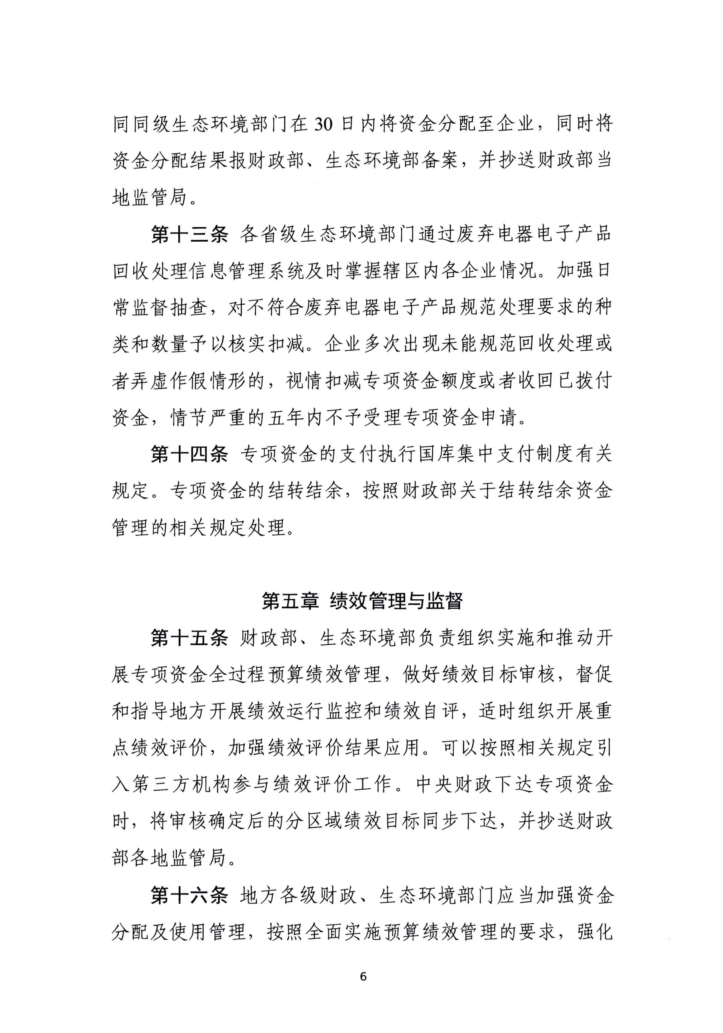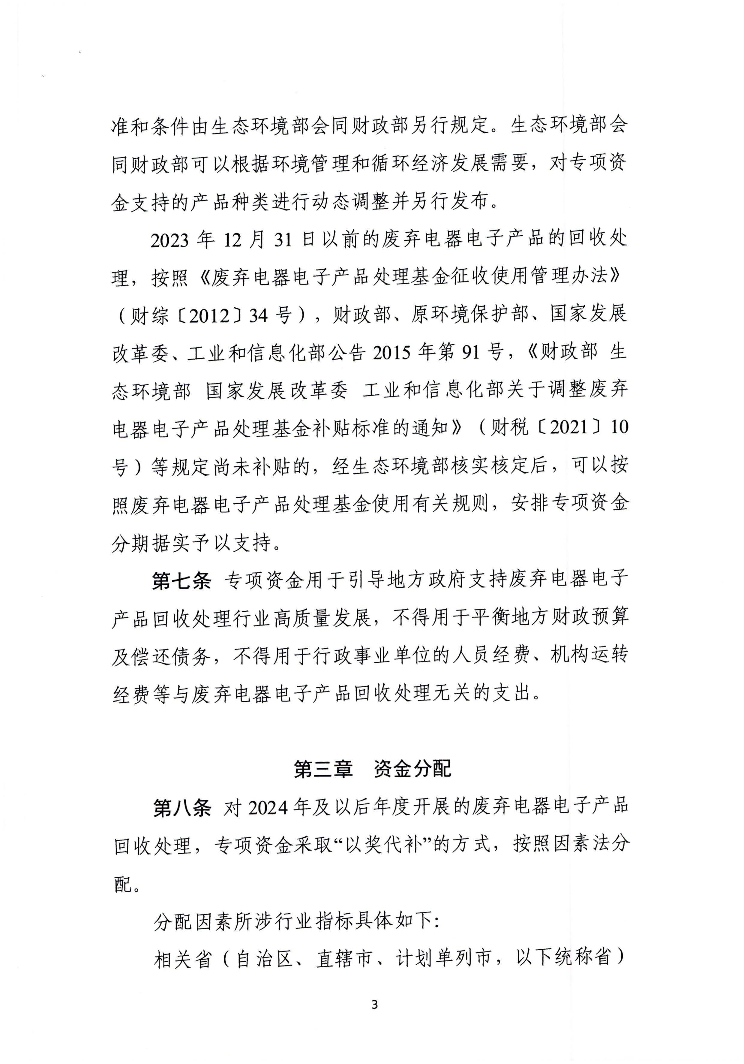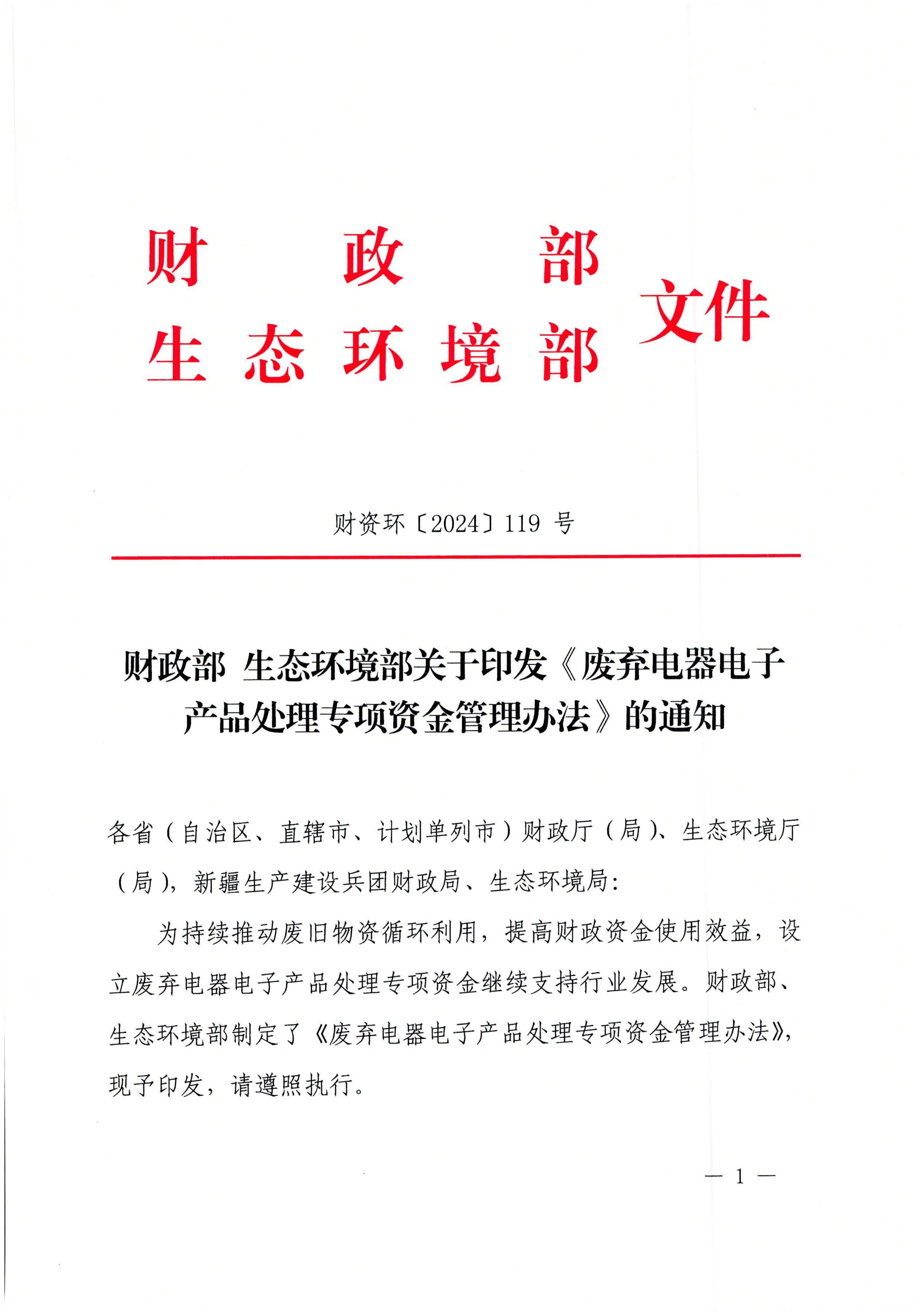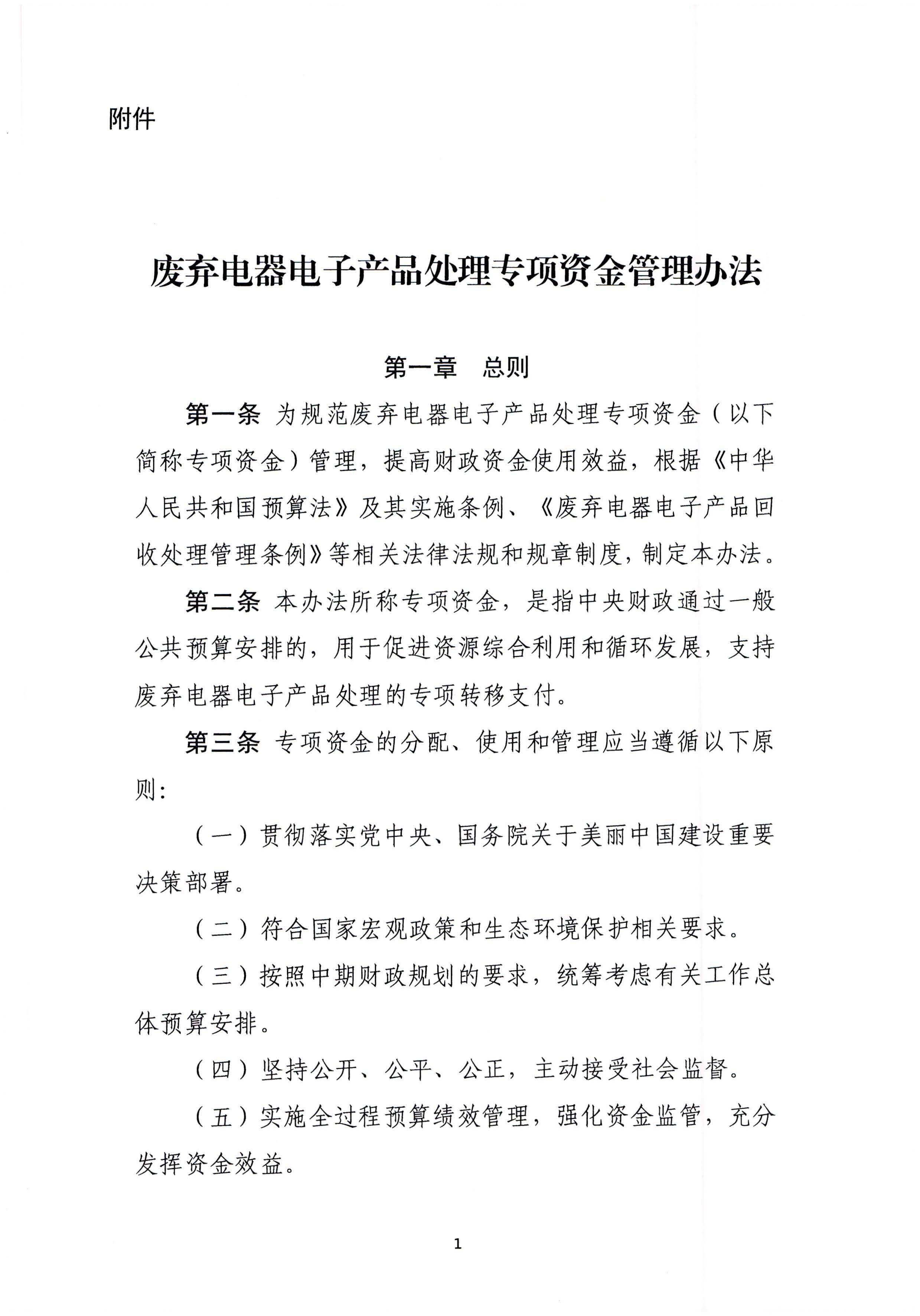 為持續(xù)推動(dòng)廢舊物資循環(huán)利用,提高財(cái)政資金使用效益,設(shè)立廢棄電器電子產(chǎn)品處理專項(xiàng)資金繼續(xù)支持行業(yè)發(fā)展。財(cái)政部、生態(tài)環(huán)境部制定了《廢棄電器電子產(chǎn)品處理專項(xiàng)資金管理辦法》,現(xiàn)予印發(fā),請(qǐng)遵照?qǐng)?zhí)行。