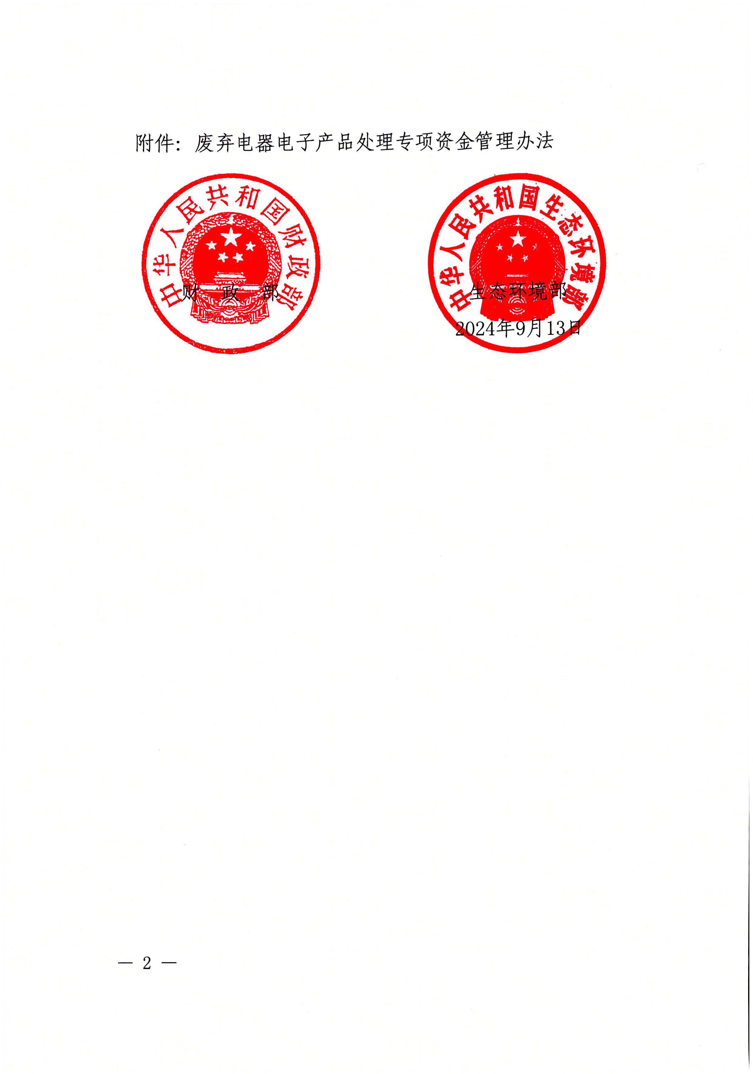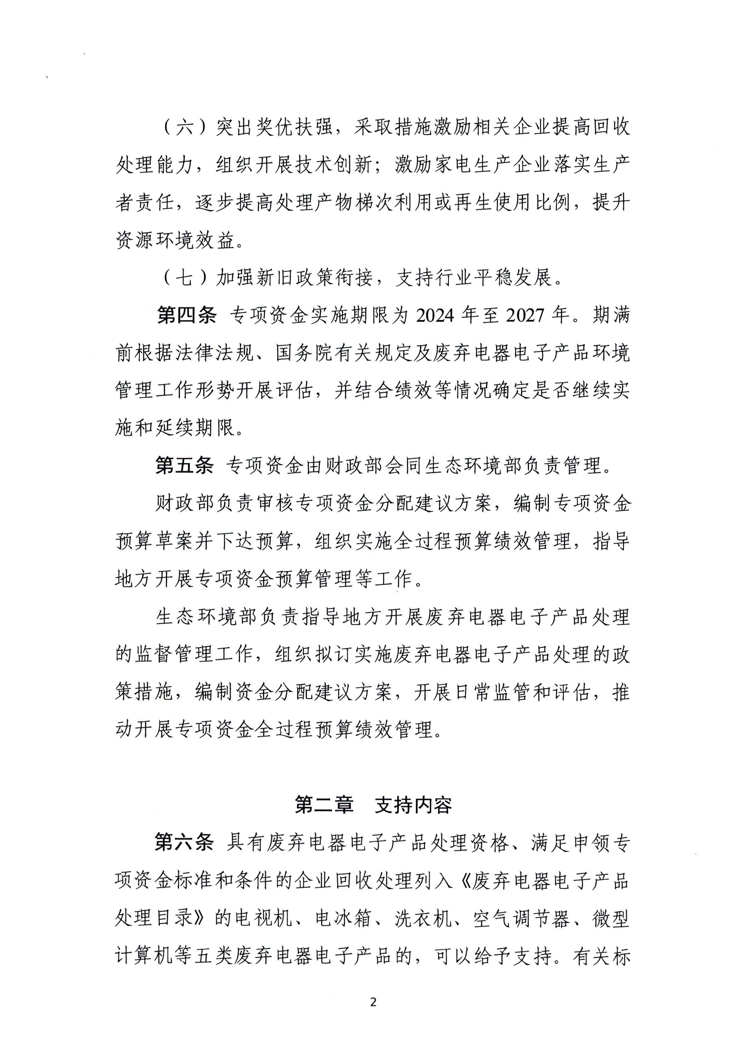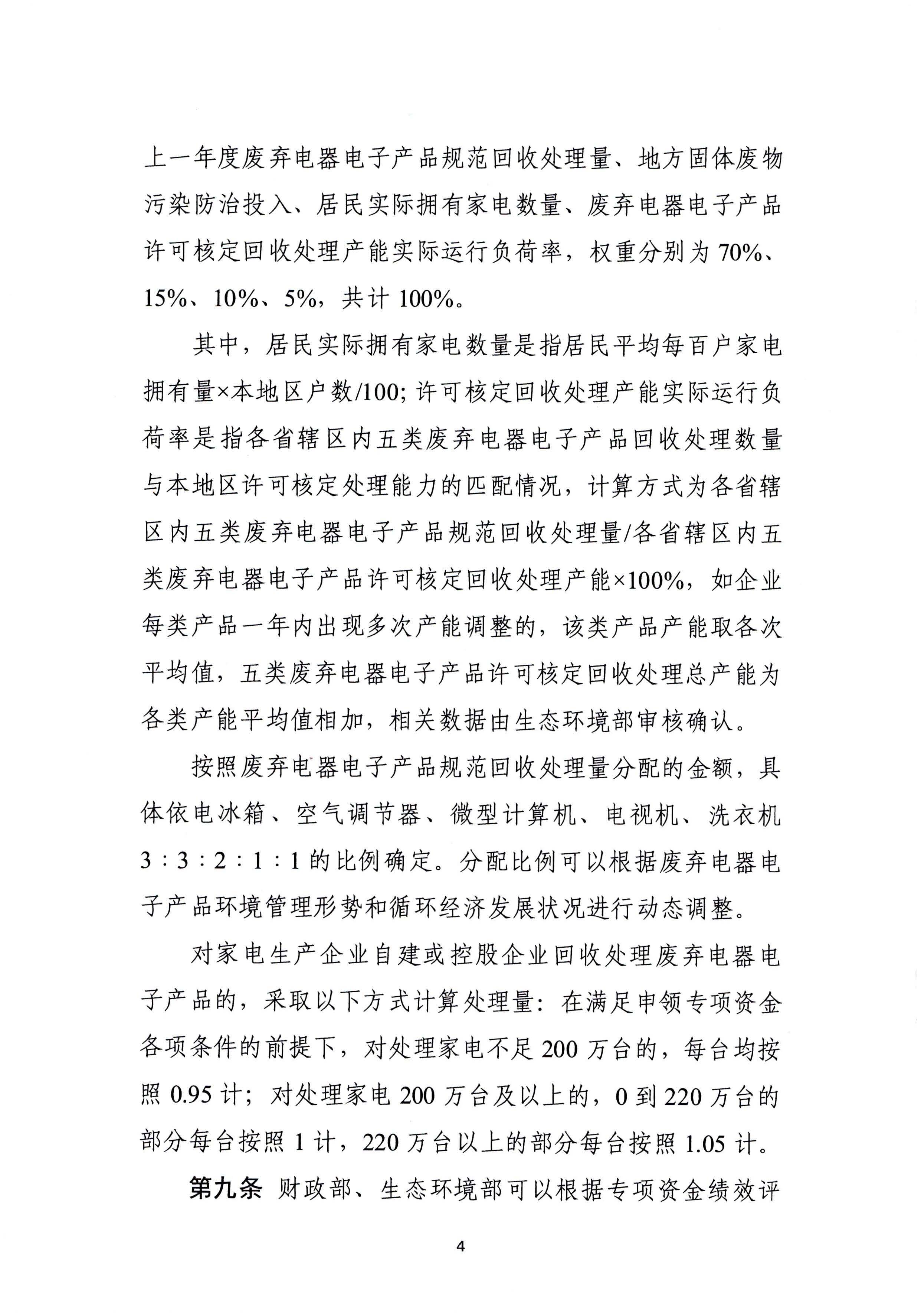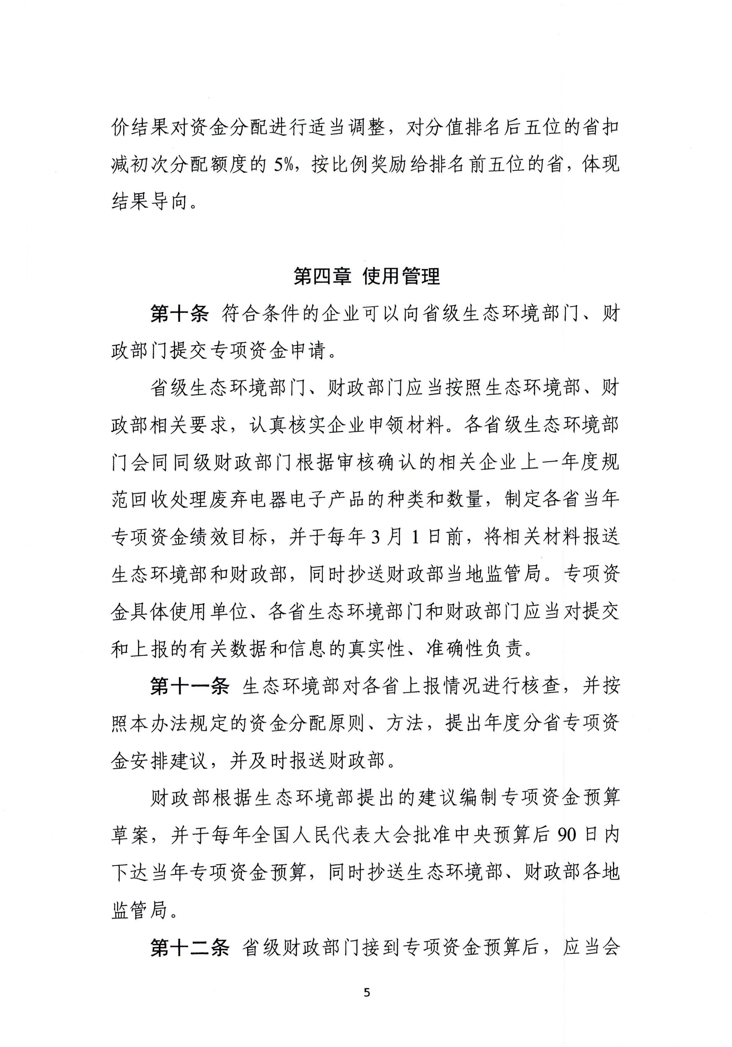為持續(xù)推動(dòng)廢舊物資循環(huán)利用,提高財(cái)政資金使用效益,設(shè)立廢棄電器電子產(chǎn)品處理專項(xiàng)資金繼續(xù)支持行業(yè)發(fā)展。財(cái)政部、生態(tài)環(huán)境部制定了《廢棄電器電子產(chǎn)品處理專項(xiàng)資金管理辦法》,現(xiàn)予印發(fā),請(qǐng)遵照?qǐng)?zhí)行。