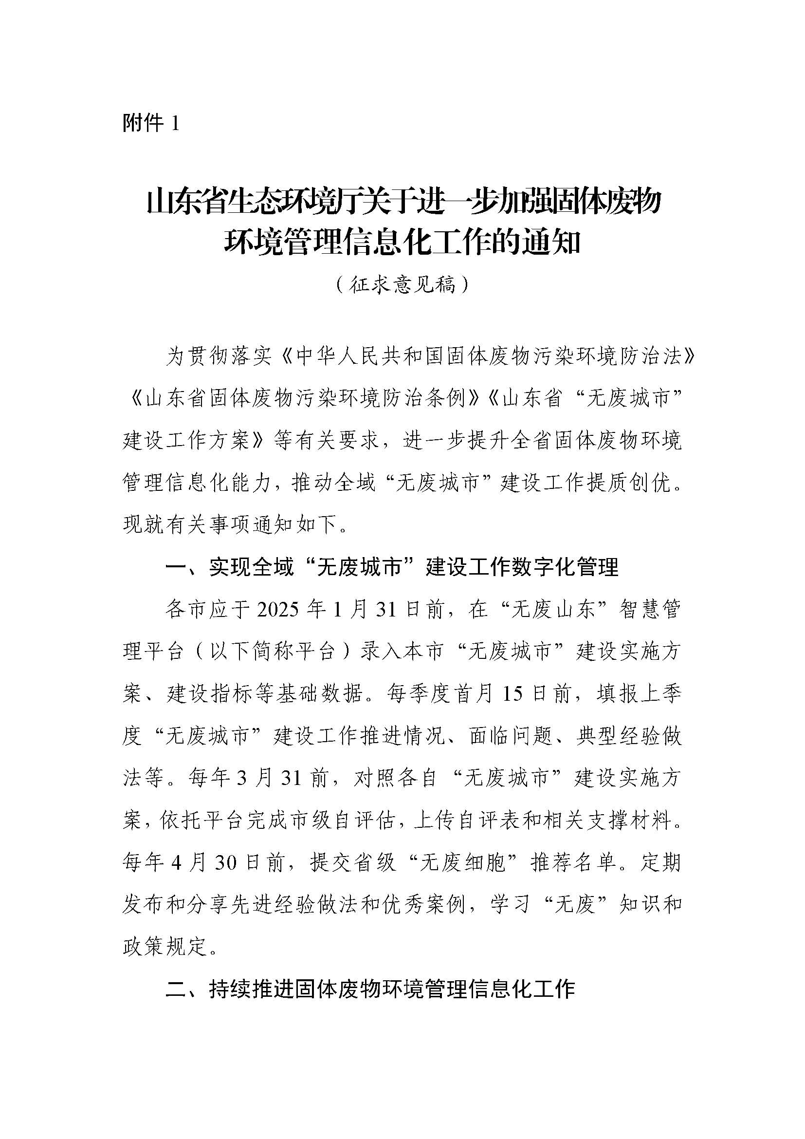 為貫徹落實《中華人民共和國固體廢物污染環(huán)境防治法》《山東省固體廢物污染環(huán)境防治條例》《山東省“無廢城市”建設(shè)工作方案》等有關(guān)要求,進一步提升全省固體廢物環(huán)境管理信息化能力,推動全域“無廢城市”建設(shè)工作,我廳組織起草了《關(guān)于進一步加強固體廢物環(huán)境管理信息化工作的通知(征求意見稿)》,現(xiàn)公開征求意見,有關(guān)意見請于2024年12月27日前反饋至聯(lián)系人郵箱。