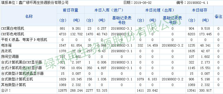 2019.08.01回收拆解統(tǒng)計(jì)表