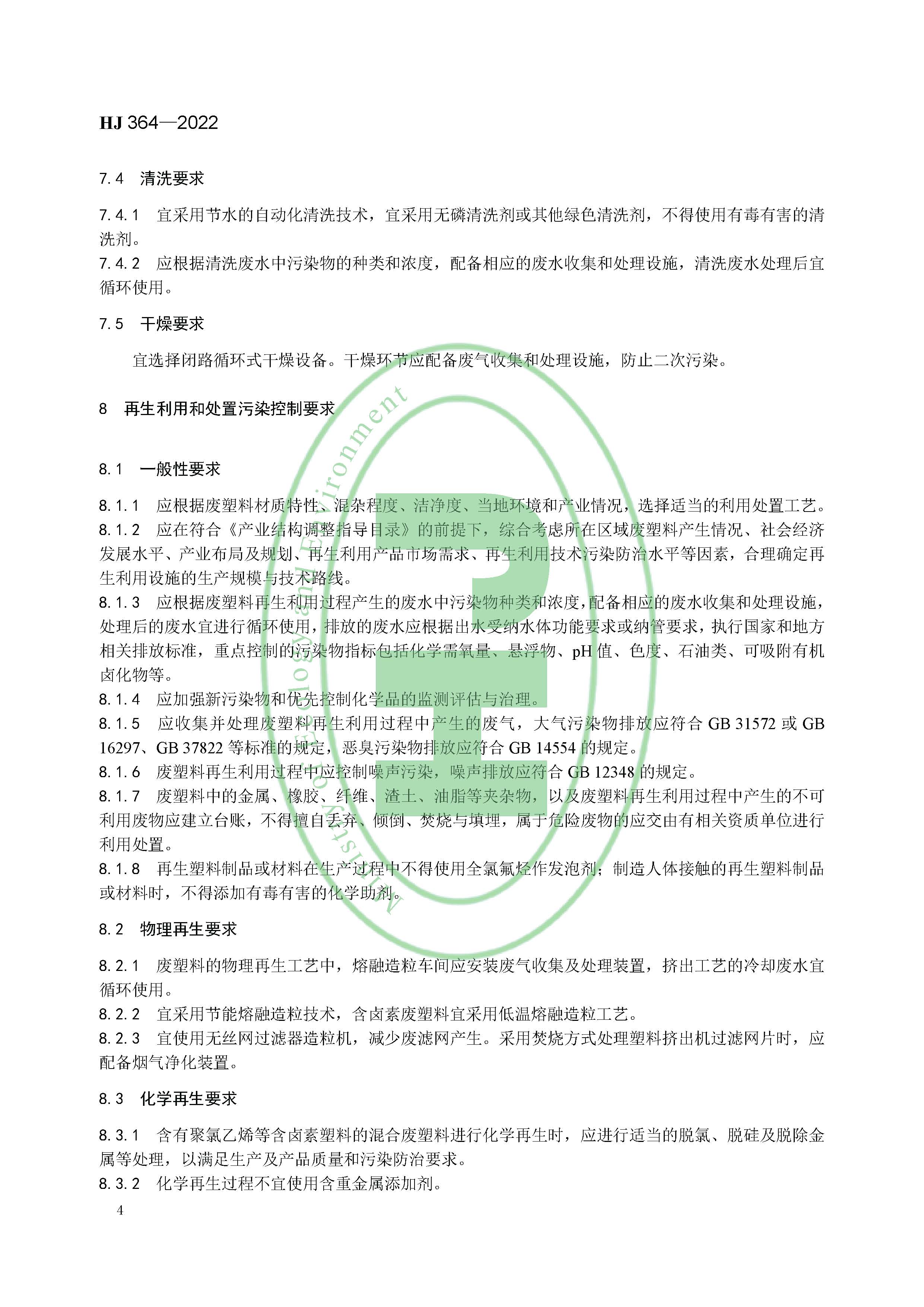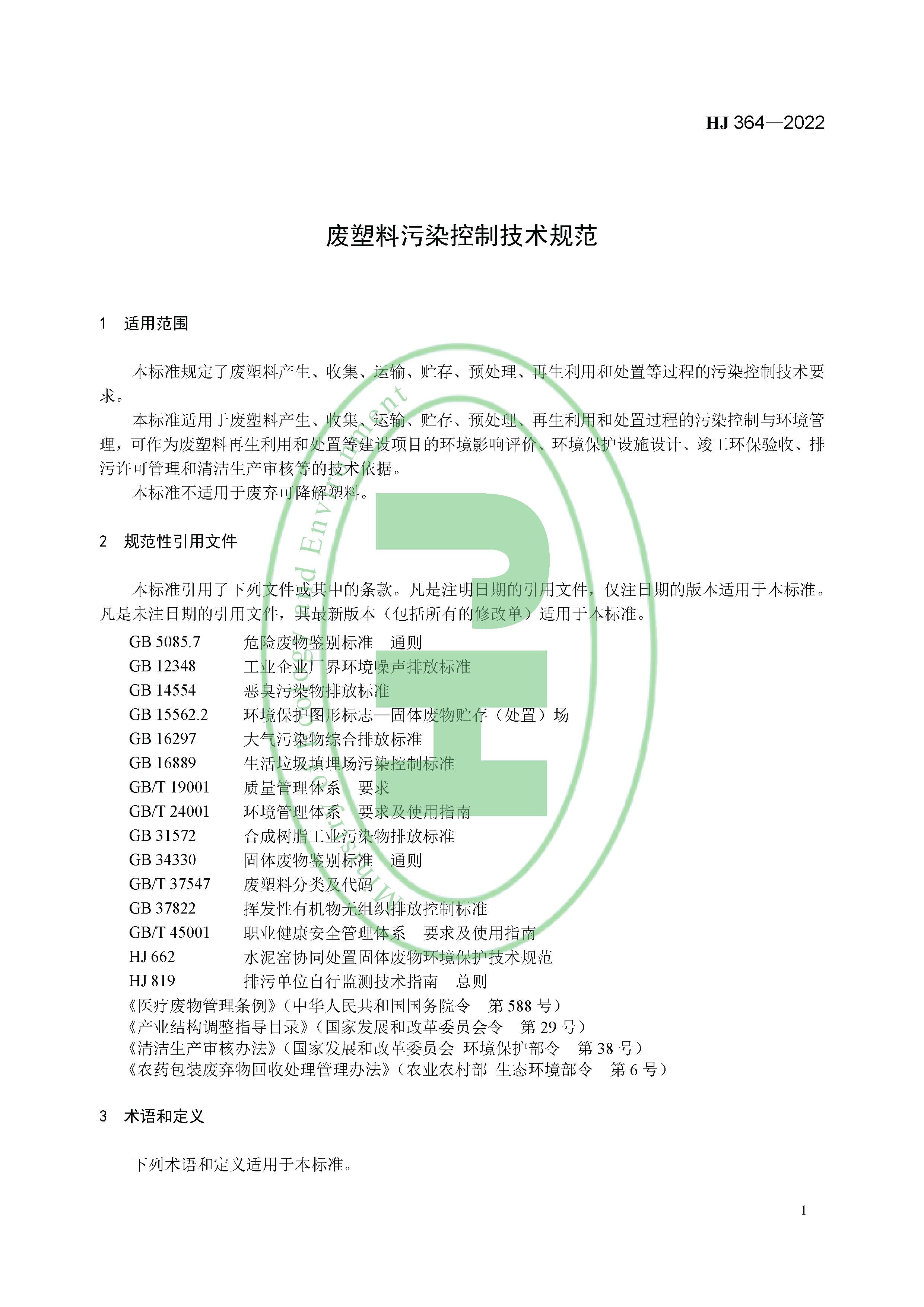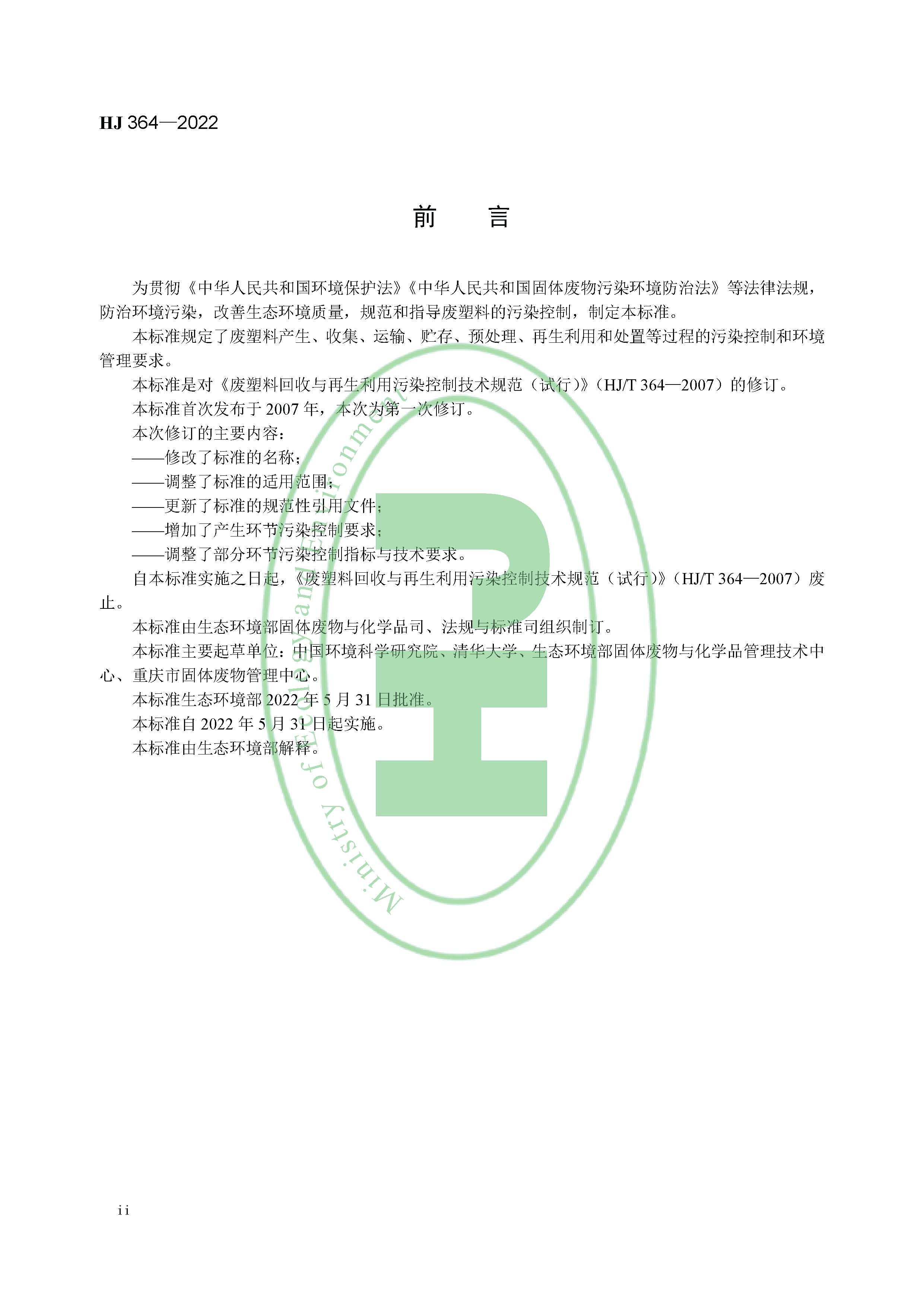 為貫徹《中華人民共和國環(huán)境保護法》《中華人民共和國固體廢物污染環(huán)境防治法》等法律法規(guī),防治環(huán)境污染,改善生態(tài)環(huán)境質(zhì)量,規(guī)范和指導廢塑料的污染控制,制定本標準。本標準規(guī)定了廢塑料產(chǎn)生、收集、運輸、貯存、預處理、再生利用和處置等過程的污染控制和環(huán)境管理要求。本標準是對《廢塑料回收與再生利用污染控制技術(shù)規(guī)范(試行)》(HJ/T 364—2007)的修訂。本標準首次發(fā)布于 2007 年,本次為第一次修訂。